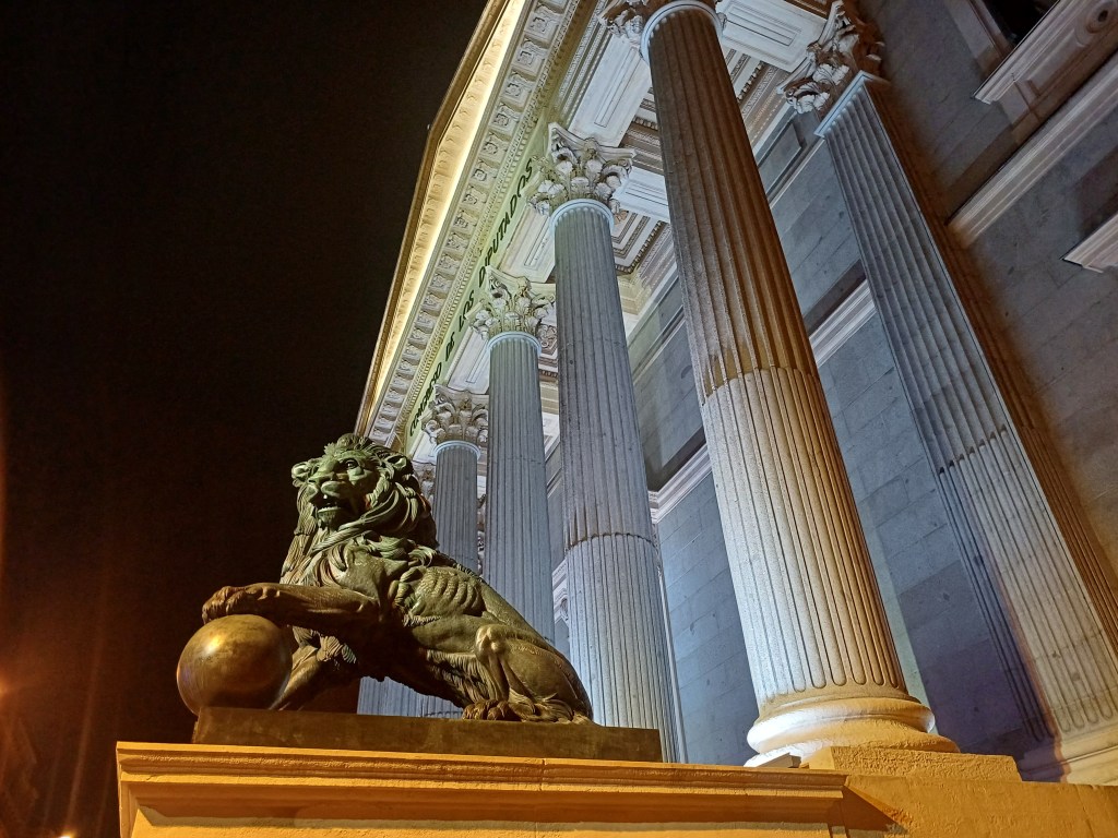 Si empiezo a pensar en la gente que hay dentro, en los chulos del todo a 100 de los nacionalistas o en los que les bailan el agua, no me fijaría en la belleza que hay fuera del Parlamento (no me gusta decir Congreso de los Diputados porque no tengo ni idea de para qué sirve el Senado). Así que paso por allí de noche. Veo la señorial entrada. Y disparo.